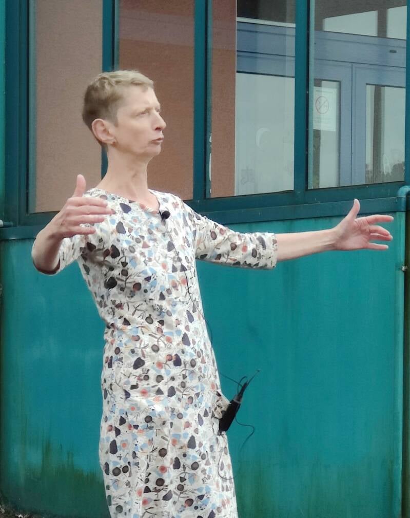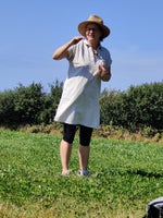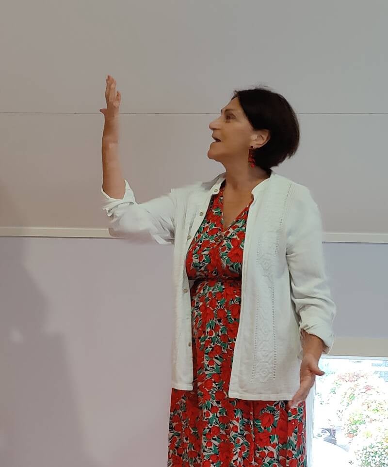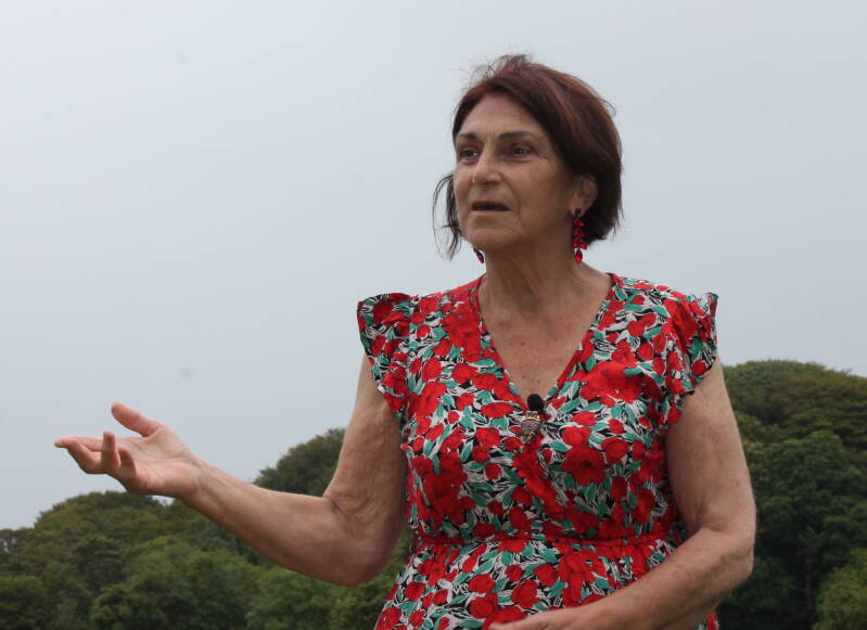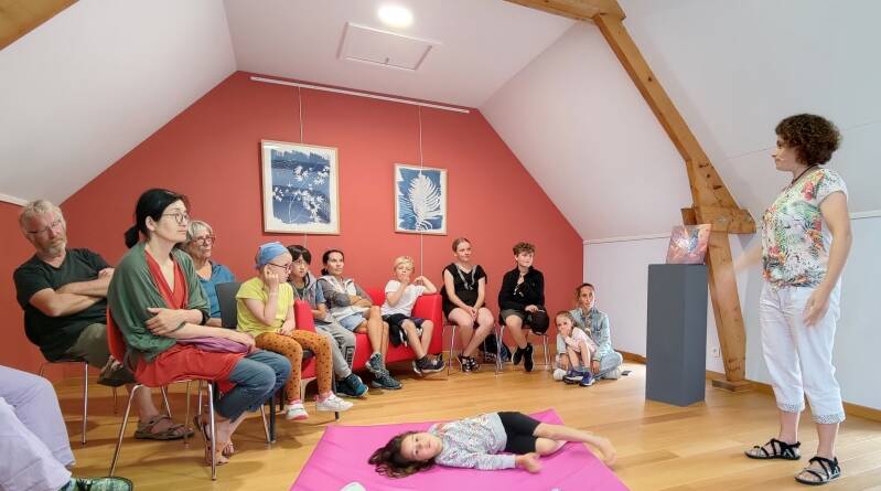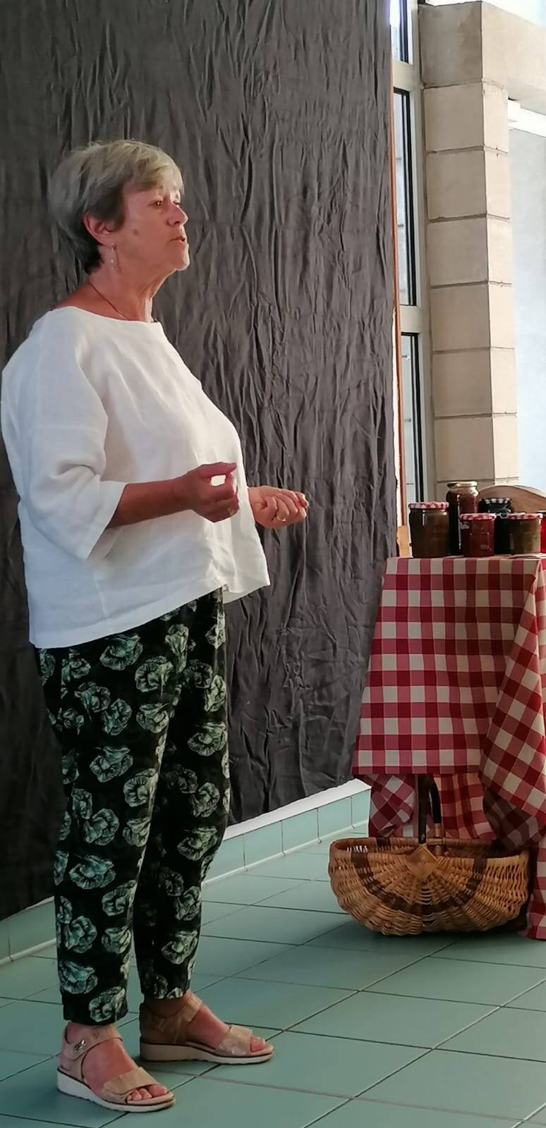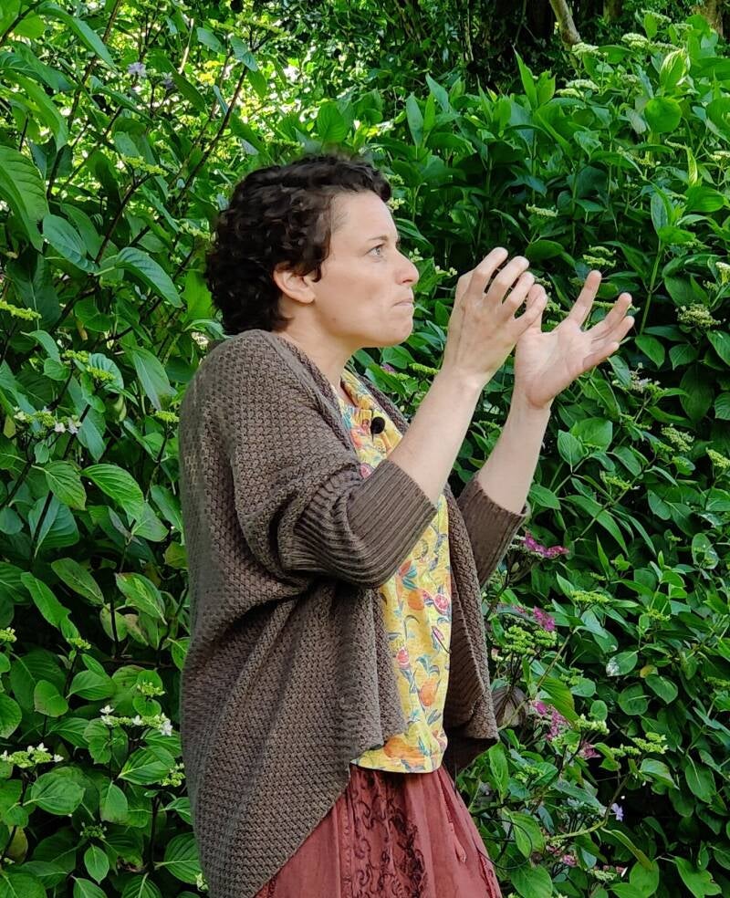 Flamanville, 20 septembre, contée à l’abri des gouttes, dans la charretterie du château de Flamanville. Le thème étant “’les îles”, quelle meilleure illustration que d’inviter Bridget Blue une habitante d’Aurigny, conteuse en français, en anglais et en langue des signes.