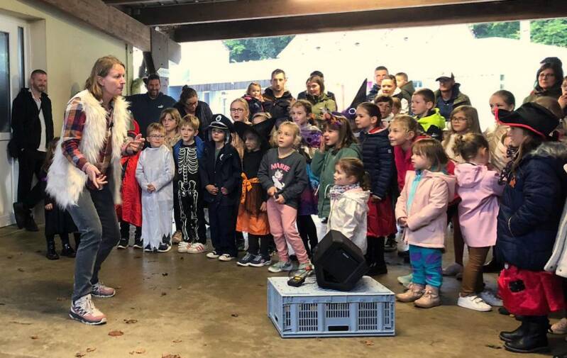 Dans les champs de pommiers de Bricquebosq, parents et enfants, venus nombreux, ont fait des rencontres inquiétantes, voyez plutôt : un chat au clair de lune, un fantôme dans un miroir, une ogresse poilue, des sorcières, une vielle dame intrépide et une autre coincée dans un panier ( de pommes !) LA MORT ...