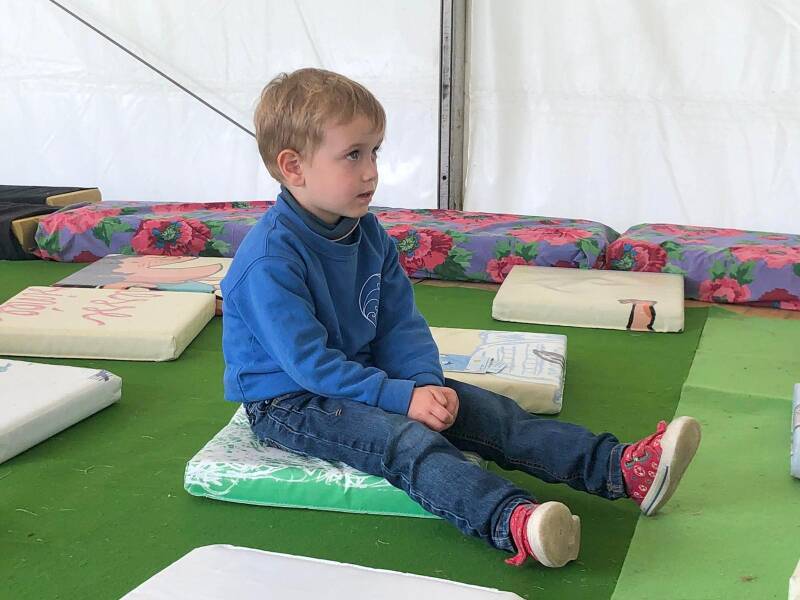 Dans la cabane à histoires, partagée avec l’association "Lire et faire lire", on va, on vient, on s’arrête. L'alternance contes et lectures fonctionne bien. Des allées et venues, du monde en permanence, un public jeune ; certains bougent, d'autres sont happés. Bref, un peu particulier, mais très sympa aussi !